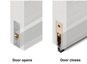 An automatic drop seal (also known as an automatic door bottom seal) is a concealed mechanism that is mortised into the bottom edge of a door. When the door closes and touches the frame, a spring mechanism automatically activates and drops a sealing bar to close the gap beneath the door.